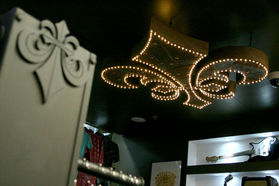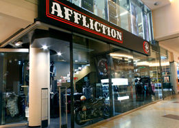 The shop interior was made by using dark raw wood and metal. We also installed red bricks on one of the walls and rest of the shop and the ceiling was painted with dark brown paint with sparkles. Ceiling is decorated with massive made to order metal chandelier in the shape of scout lily - symbol from Affliction logo. To light this one up, we have used three christmas LED lighting chains for a great. Dividing wall for changing cabin was made using metal plates with rivets.
